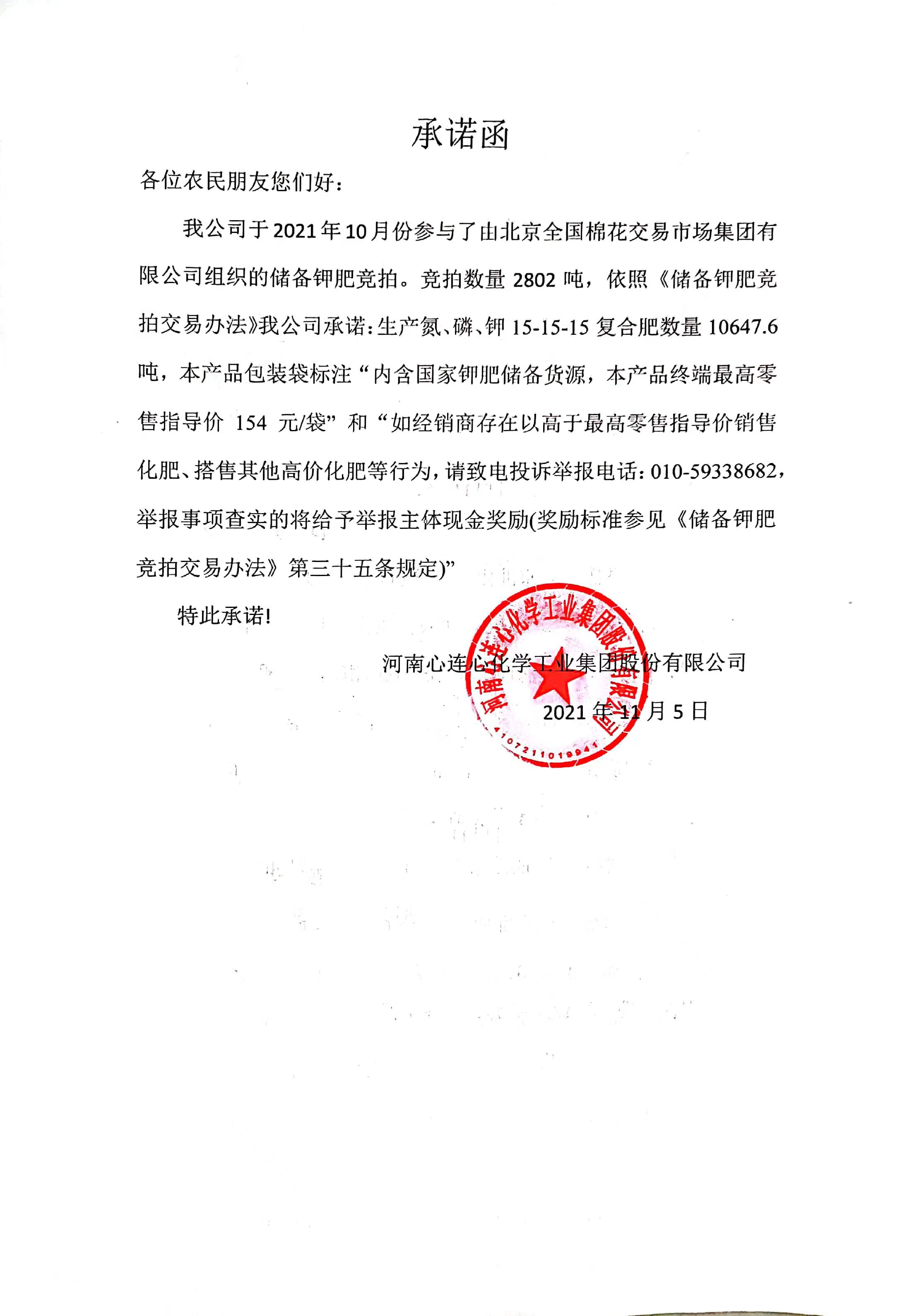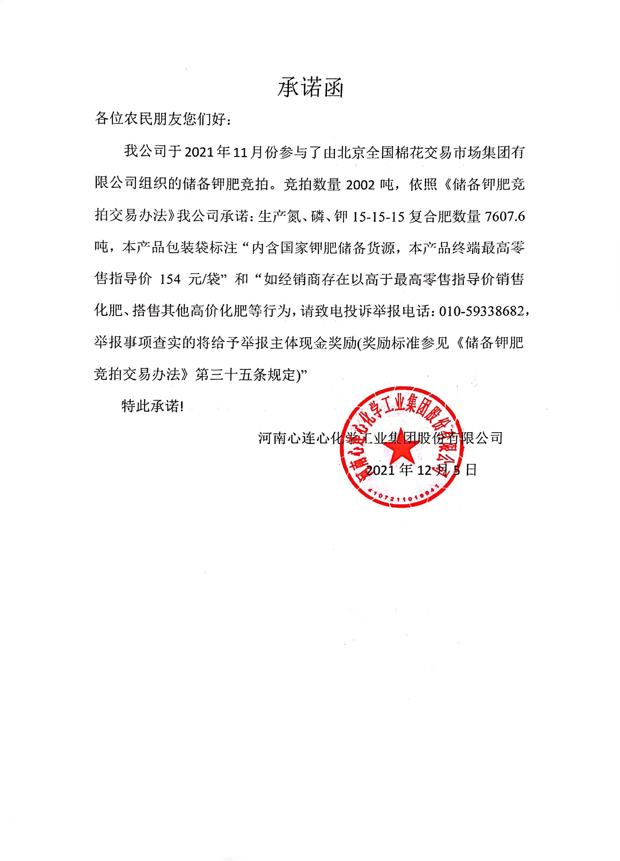 河南心连心化学工业集团股份有限公司分别于2021年10月、11月份参与了由北京全国棉花交易市场集团有限公司组织的储备钾肥竞拍。依照《储备钾肥竞拍交易办法》公司做出以下承诺,详见附件:
